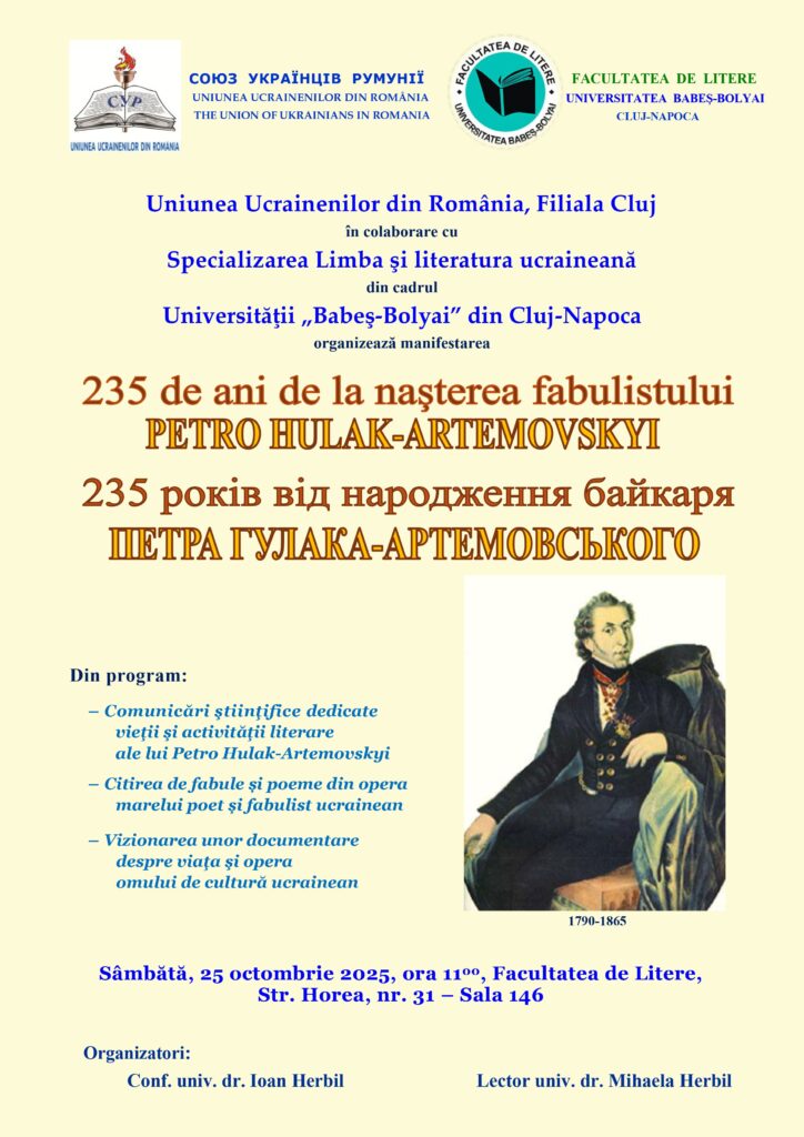 Facultatea de Litere în colaborare cu Uniunea Ucrainenilor din România – Filiala Cluj vă invită la evenimentul organizat cu ocazia împlinirii a 235 de ani de la nașterea fabulistului Petro Hulak-Artemovskyi.