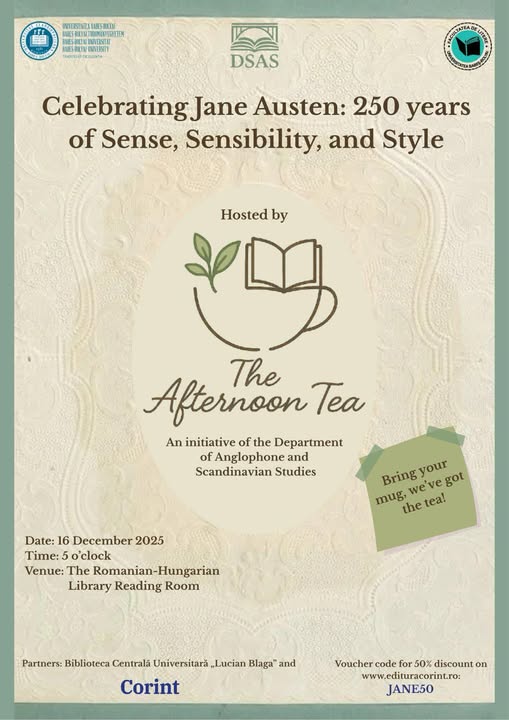 Facultatea de Litere, în colaborare cu Editura Corint, vă invită la un ceai aniversar pentru a sărbători 250 de ani de la nașterea autoarei britanice Jane Austen. Evenimentul se desfășoară sub egida – The Afternoon Tea, o inițiativă a Departamentului de Studii Anglofone și Scandinave ce constă într-o serie de întâlniri lunare din semestrul de toamnă-iarnă și la care sunt invitați atât studenți și cadre didactice ale universității, cât și elevi și profesori din învâțământul preuniversitar. În cadrul evenimentului se vor prezenta aspecte biografice din viața autoarei și se vor citi și analiza fragmente relevante din romanele acesteia.