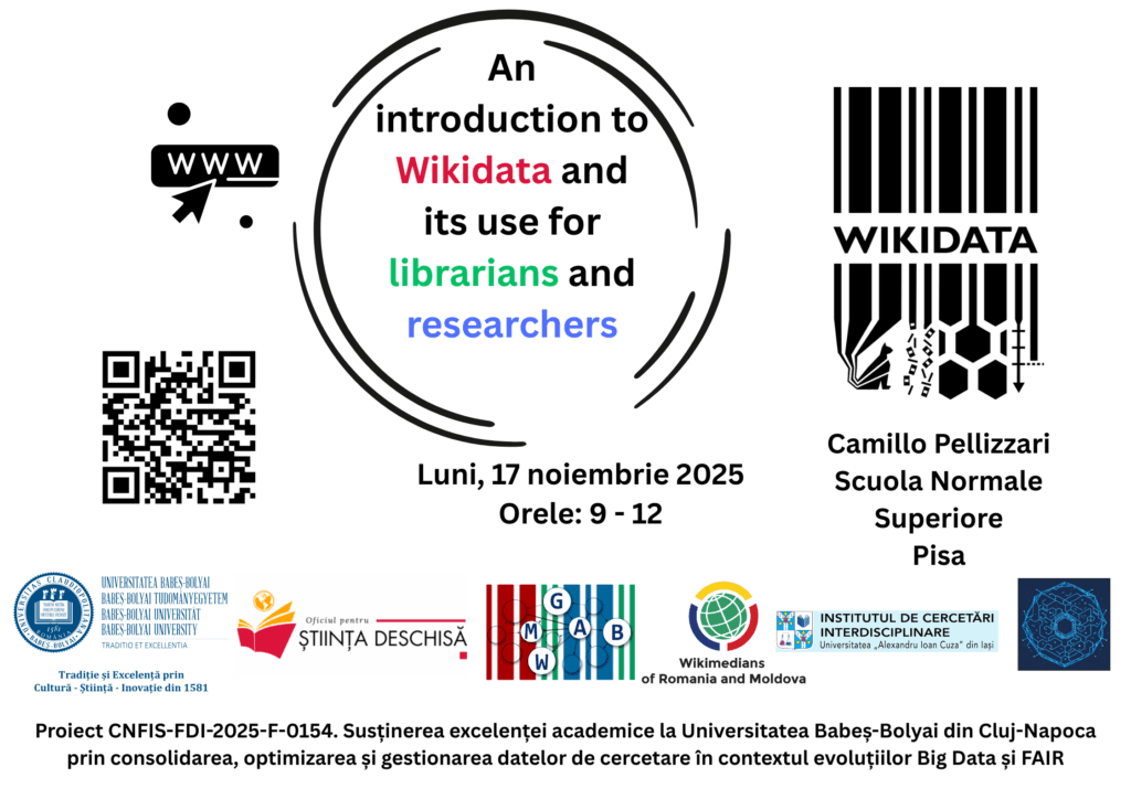 Oficiul pentru Știința Deschisă din cadrul Universității Babeș-Bolyai, în parteneriat cu Wikimedians of Romania and Moldova și Wikidata și în colaborare cu Institutul de Cercetări Interdisciplinare al Universității Alexandru Ioan Cuza din Iași – Digital Humanities Laboratory, vă invită la sesiunea de training – An introduction to Wikidata and its use for librarians and researcher, susținută de Camillo Pelizzari, Scuola Normale Superiore di Pisa. Sesiunea se adresează bibliotecarilor și cercetătorilor din România și va explora modalitățile prin care informațiile disponibile în Wikidata pot fi integrate în activitățile profesionale și în instrumentele de referință utilizate în aceste domenii.