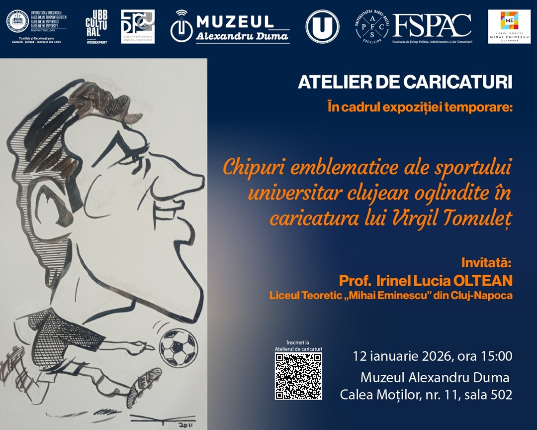 Direcția Patrimoniu Cultural Universitar din cadrul Universității Babeș-Bolyai, prin Muzeul Alexandru Duma, vă invită la un atelier de caricaturi organizat în ambianța inspiratoare a expoziției temporare pe care o găzduiește în prezent: Chipuri emblematice ale sportului universitar clujean oglindite în caricatura lui Virgil Tomuleț. Participanții vor explora diferite tehnici de executare a caricaturilor sub îndrumarea doamnei profesor Irinel Lucia Oltean, de la Liceul Teoretic Mihai Eminescu din Cluj-Napoca.