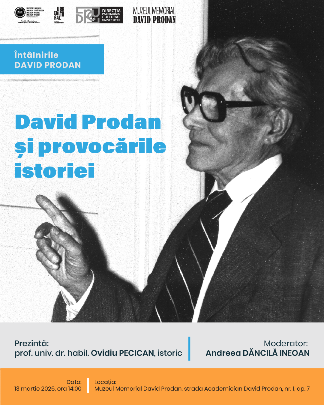Direcția Patrimoniu Cultural Universitar din cadrul Universității Babeș-Bolyai, prin Muzeul Memorial David Prodan, vă invită la prelegerea – David Prodan și provocările istoriei, susținută de Dl. prof. univ. dr. habil Ovidiu Pecican, istoric. Evenimentul face parte din seria Întâlnirile David Prodan.