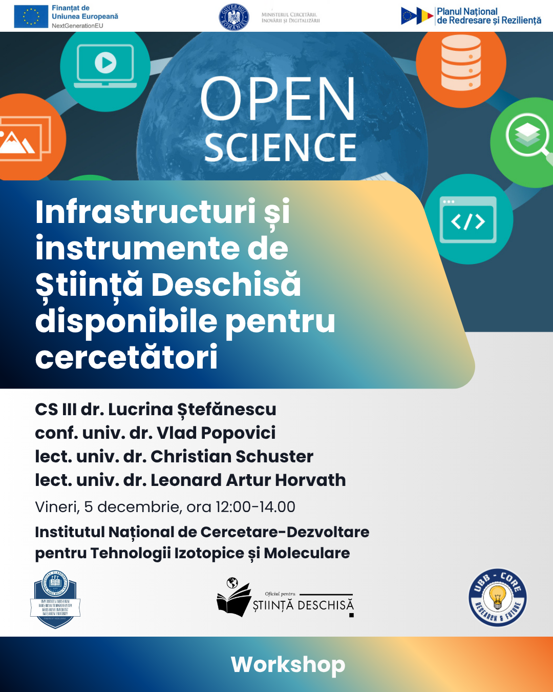 Universitatea Babeș-Bolyai din Cluj-Napoca prin Centrul Regional Nord-Vest de Orientare în Carieră al Cercetătorilor, UBB-CORE vă invită la workshopul cu tema – Infrastructuri și instrumente de Știință Deschisă disponibile pentru cercetători. Evenimentul este dedicat întregului personal al Institutului Național de Cercetare-Dezvoltare pentru Tehnologii Izotopice și Moleculare.