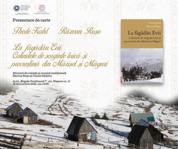 Facultatea de Istorie și Filosofie din cadrul Universității Babeș-Bolyai vă invită la prezentarea volumului – La făgădău Evii. Colindele de sorginte laică și precreștină din Mărișel și Măguri, semnat de Thede Kahl și Răzvan Roșu. Evenimentul este urmat de un moment de colinde și muzică tradițională susținut de Răzvan Roșu și Glasul Moților.