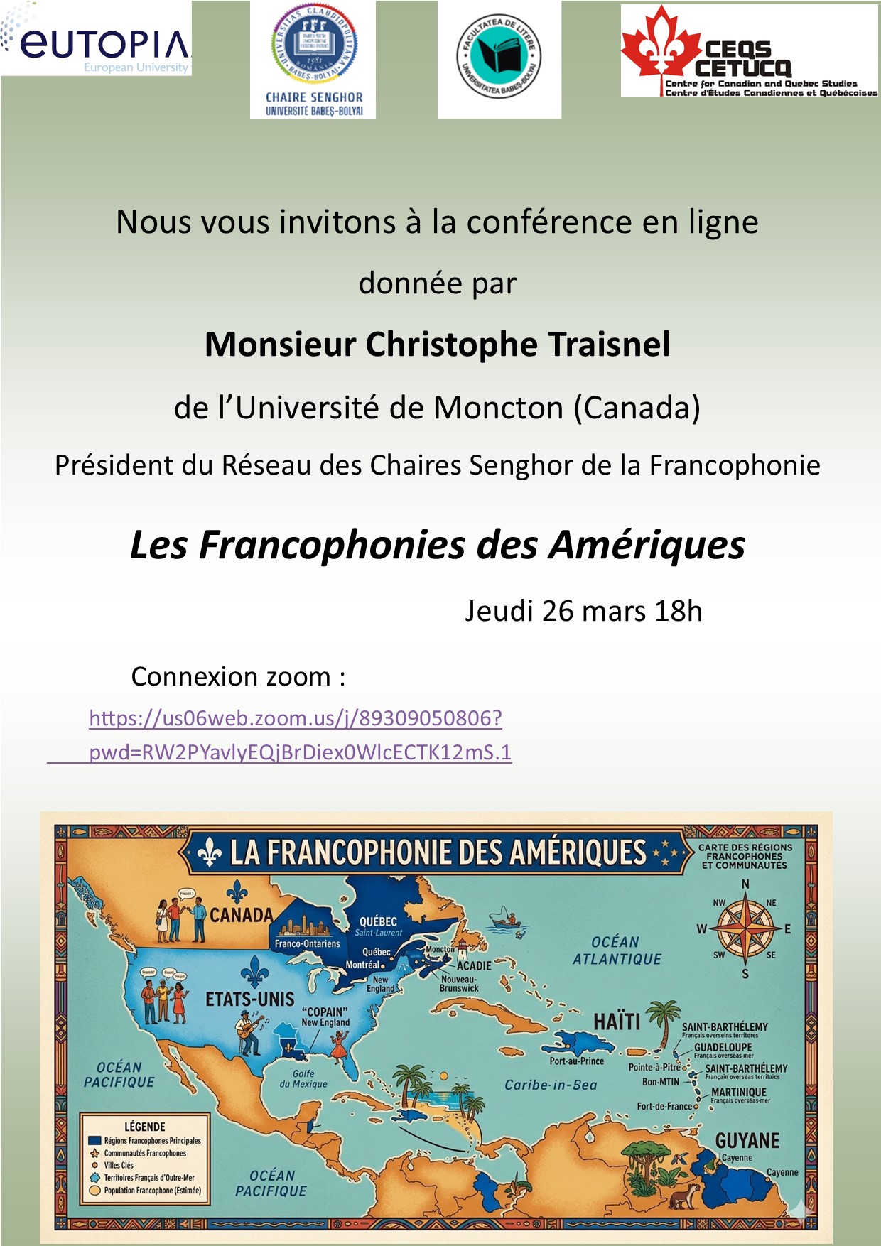 Facultatea de Litere, Centrul de Studii canadiene și chebecheze și Rețeaua Catedrelor Senghor ale Francofoniei vă invită la conferința susținută de Dl. prof. Christophe Traisnel, Universitatea din Moncton, Canada. Conexiune zoom: https://us06web.zoom.us/j/89309050806?pwd=RW2PYavlyEQjBrDiex0WlcECTK12mS.1
