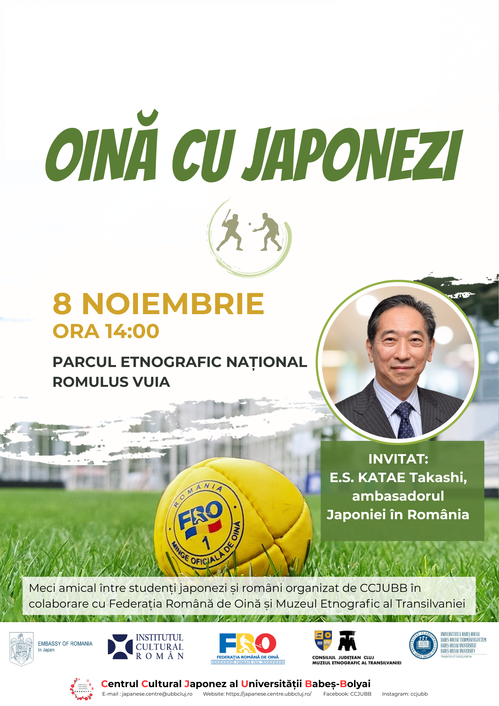 Centrul Cultural Japonez al Universității Babeș-Bolyai în colaborare cu Federația Română de Oină și Muzeul Etnografic al Transilvaniei vă invită la un meci amical între studenți japonezi și studenți români. La eveniment va fi prezent E.S. Katae Takashi, ambasadorul Japoniei în România.