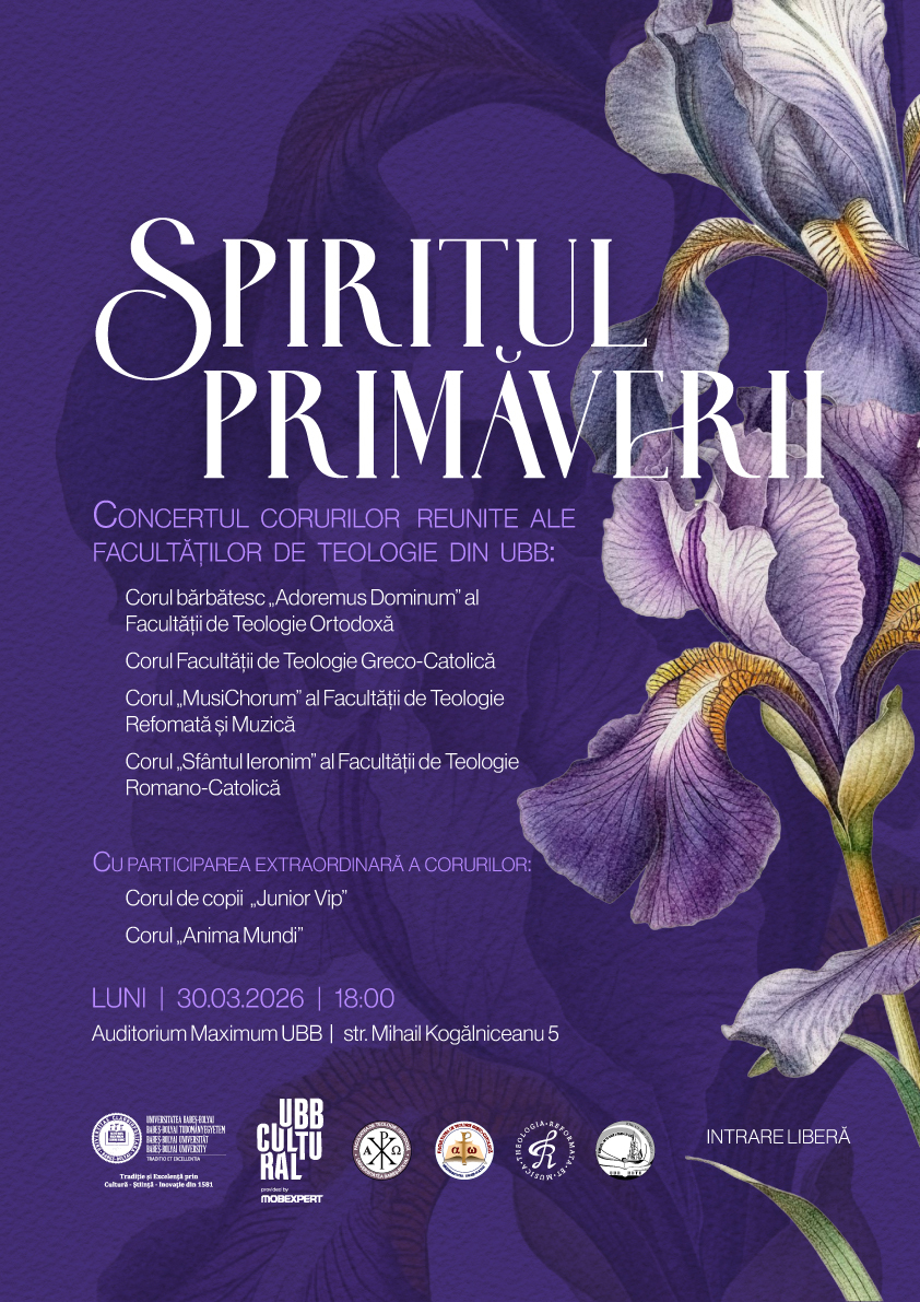 Universitatea Babeș-Bolyai prin UBB Cultural (By Mobexpert) vă invită la concertul de muzică sacră – Spiritul primăverii. Corurile reunite ale facultăților de teologie din UBB. Evenimentul evidențiază patrimoniul cultural și caracterul multiconfesional al comunității academice. Corurile facultăților de teologie ale UBB vor crea un dialog cultural între tradiții și generații, fiecare ansamblu aducând propria identitate și specific. Evenimentul este realizat de Universitatea Babeș-Bolyai, în cadrul UBB Cultural (by Mobexpert), cu sprijinul facultăților de teologie participante, și se adresează tuturor iubitorilor de muzică corală și comunității clujene. Intrarea este liberă.