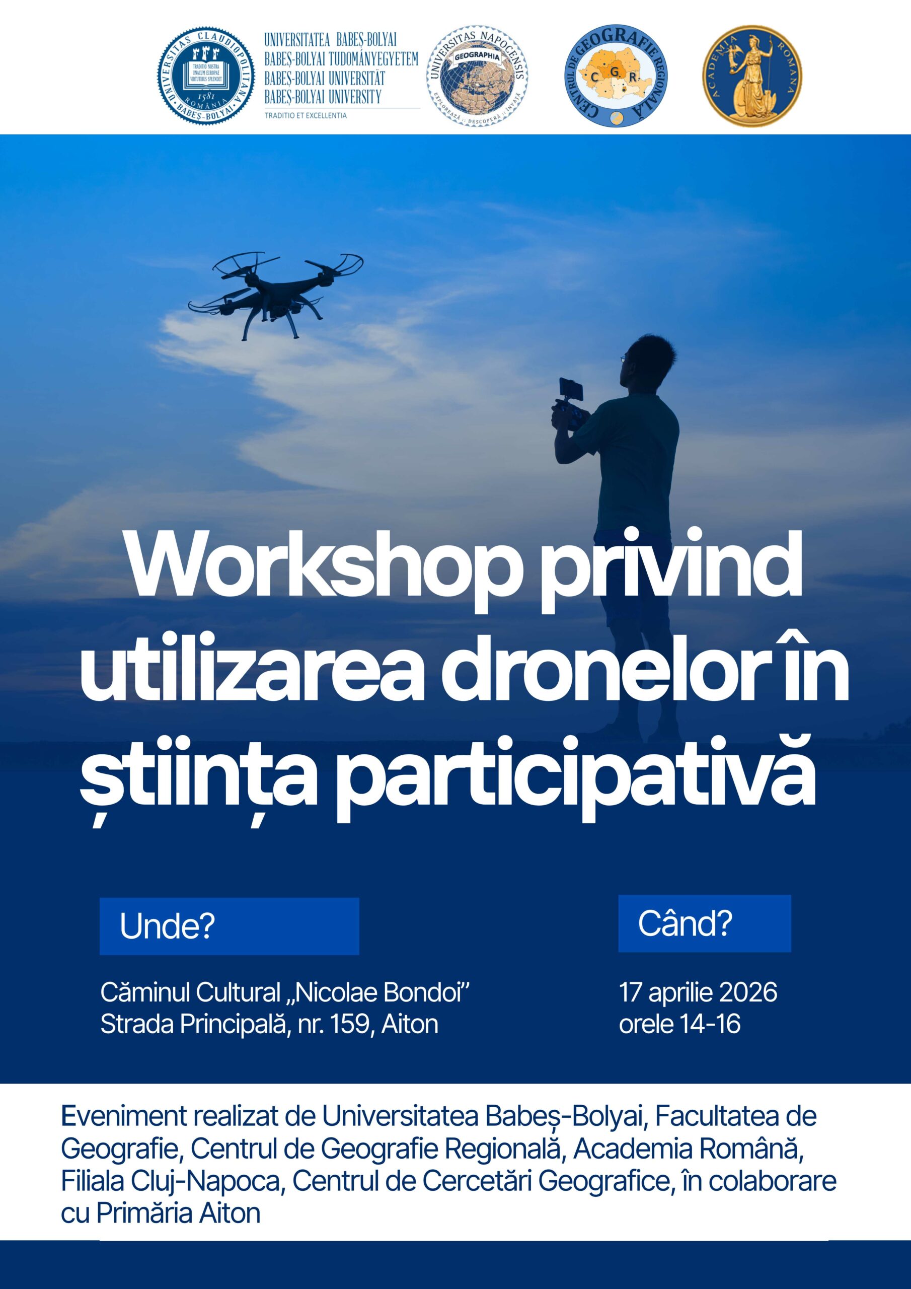 Centrul de Geografie Regională din cadrul Facultății de Geografie, Universitatea Babeș-Bolyai, împreună cu Centrul de Cercetări Geografice al Academiei Române filiala Cluj-Napoca, în parteneriat cu Primăria Aiton, vă invită la un workshop dedicat utilizării dronelor în știința cetățenească. Participanții vor afla despre beneficiile dronelor și ale imaginilor aeriene în știința participativă, precum și despre drepturile și obligațiile cetățenilor în legătură cu datele aeriene colectate.