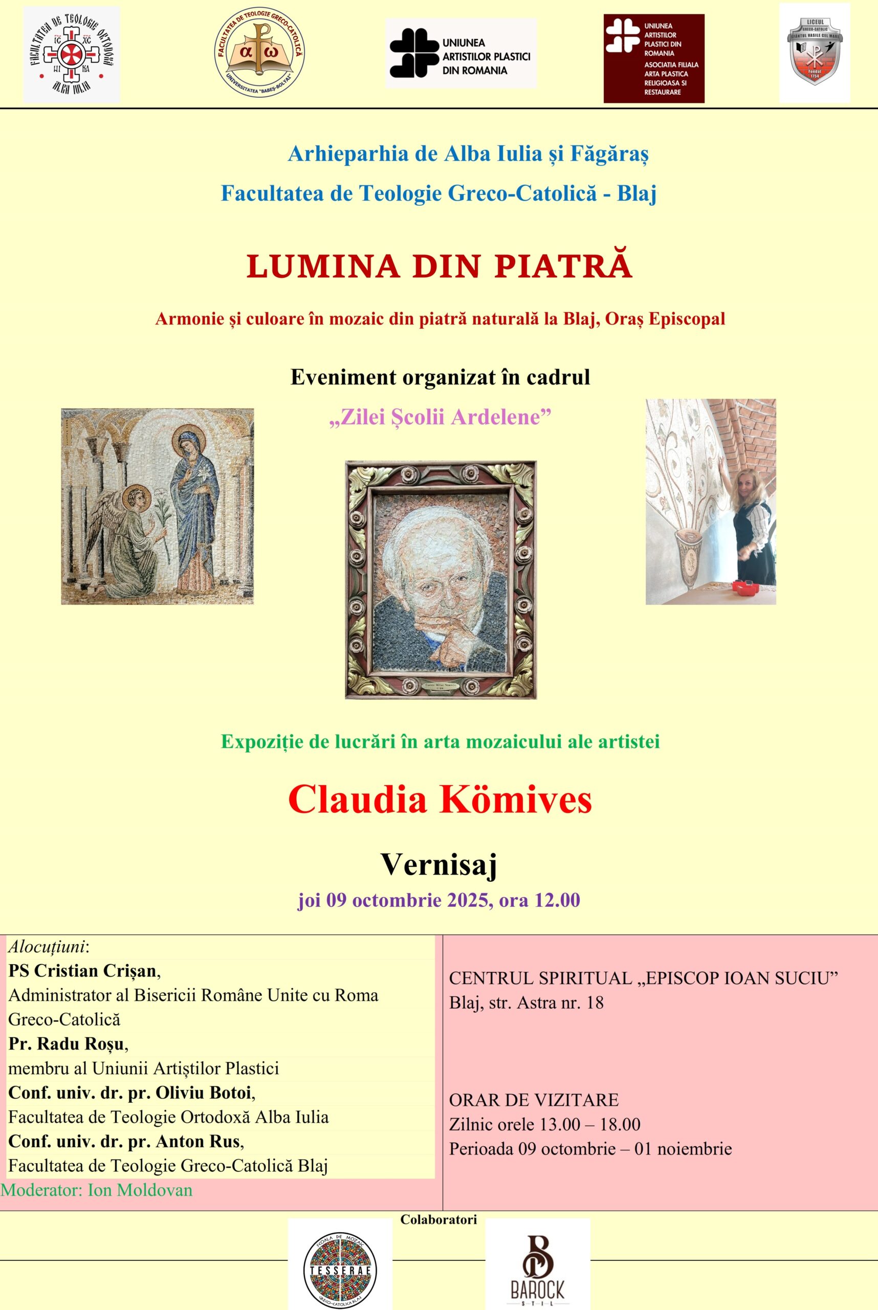 Centrul Spiritual Episcop Ioan Suciu str. Astra nr. 18, BlajFacultatea de Teologie Greco-Catolică Departamentul Blaj, vă invită la vernisajul expoziției - Lumina din piatră, expoziție de lucrări în arta mozaicului ale artistei Claudia Kömives. Expoziția poate fi vizitată până în data de 1 noiembrie 2025, zilnic, în intervalul orar …