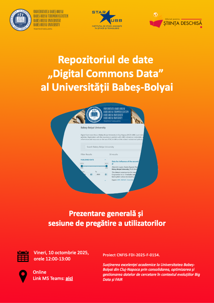 Platforma TeamsOficiul pentru Știința Deschisă al Universității Babeș-Bolyai organizează săptămânal, în perioada 3 octombrie - 28 noiembrie 2025, sesiuni online de prezentare și pregătire a utilizatorilor pentru repozitoriul de date - Digital Commons Data – UBB. Între 3 octombrie și 21 …