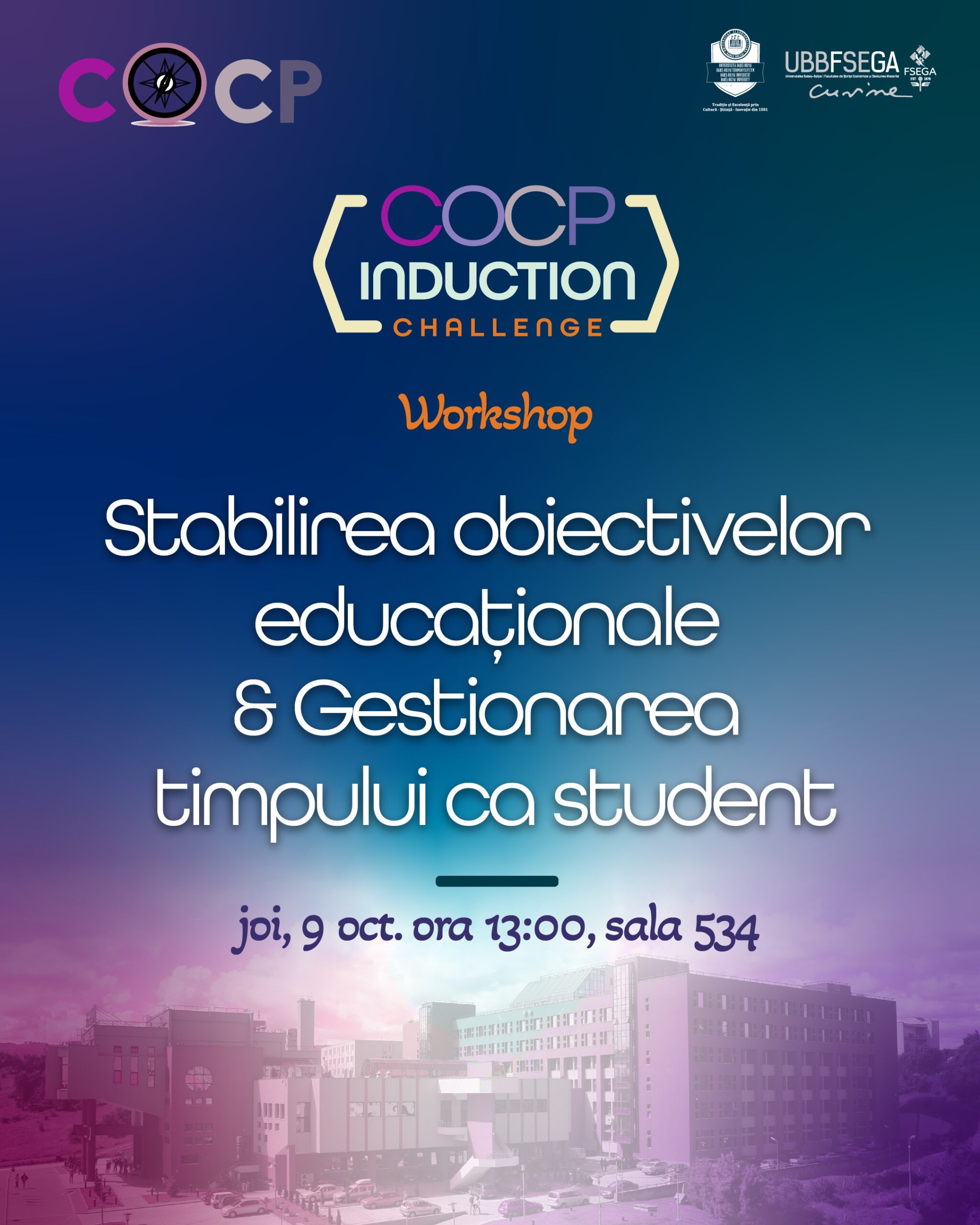 Facultatea de Științe Economice și Gestiunea Afacerilor, sala 534 Str. Teodor Mihali nr. 58-60, Cluj-NapocaFacultatea de Științe Economice și Gestiunea Afacerilor prin Centrul de Orientare și Consiliere Profesională își invită studenții la workshopul - Stabilirea obiectivelor educaționale & Gestionarea timpului ca student. Participarea necesită înscriere prealabilă.