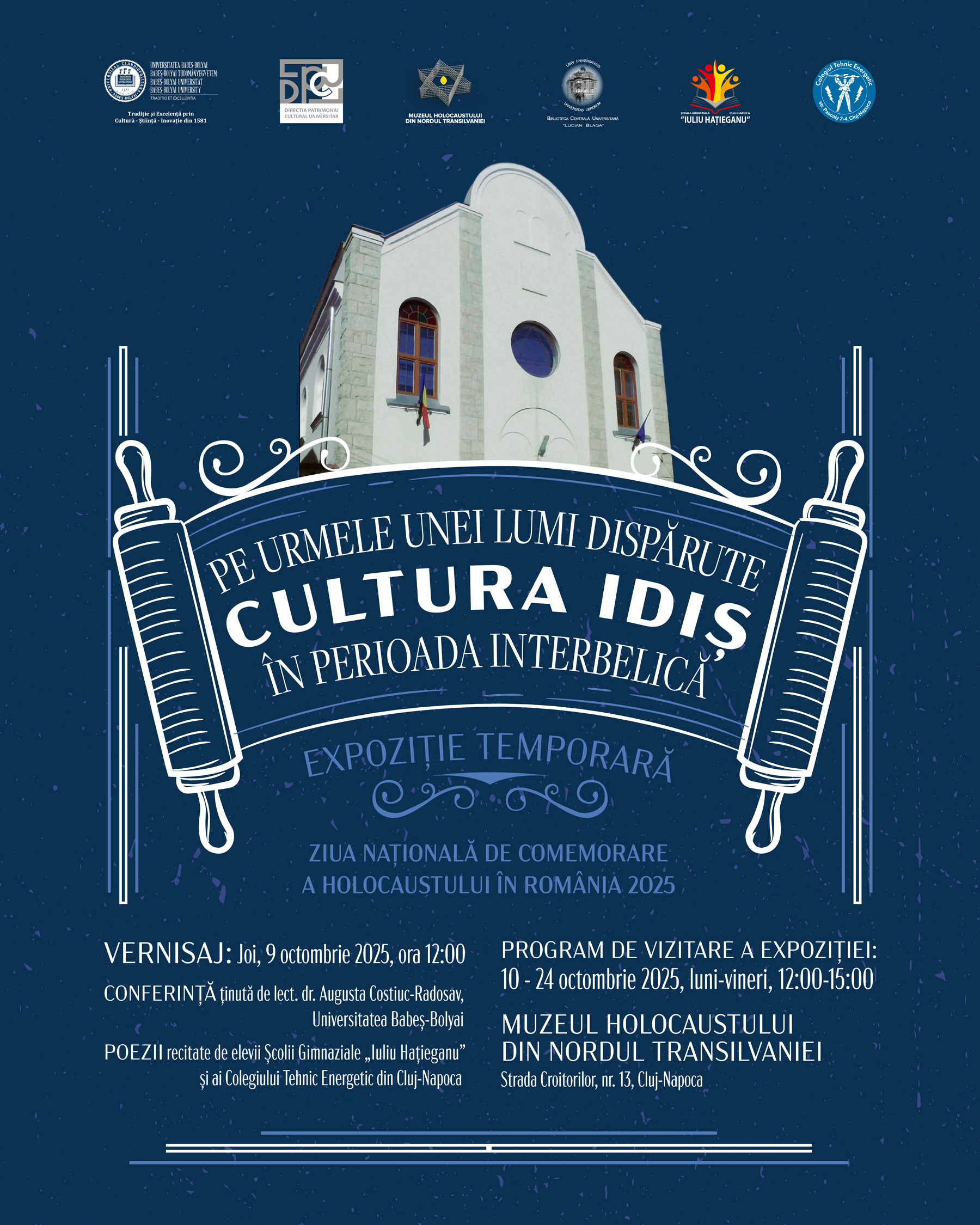 Muzeul Holocaustului str. Croitorilor nr. 13, Cluj-NapocaDirecția Patrimoniu Cultural Universitar din cadrul Universității Babeș-Bolyai prin Muzeul Virtual și Documentar al Holocaustului din Nordul Transilvaniei, organizează, cu ocazia Zilei Naționale de Comemorare a Victimelor Holocaustului, evenimentul - Pe urmele unei lumi dispărute: Cultura idiș în perioada interbelică. …