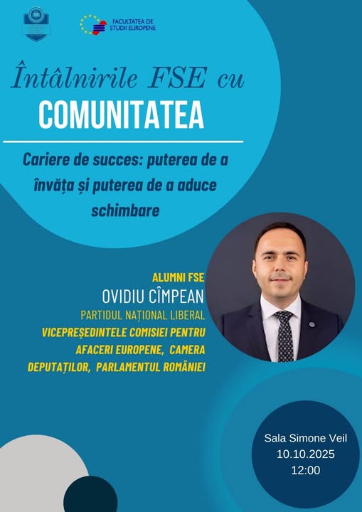 Facultatea de Studii Europene sala S. Veil str. Emmanuel de Martonne, nr. 1, Cluj-NapocaFacultatea de Studii Europene din cadrul Universității Babeș-Bolyai vă invită la un nou eveniment organizat în cadrul seriei Întâlnirile FSE cu comunitatea, avându-l ca invitat pe Dl. Ovidiu Cîmpean, Camera Deputaților, Parlamentul României.