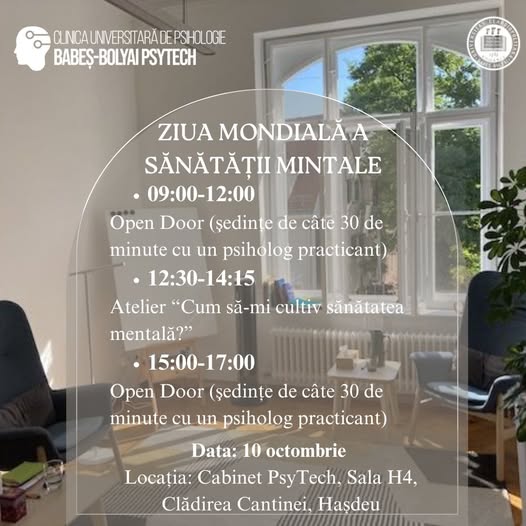 Clinica de Universitară de Psihologie Babeș-Bolyai Psytech str. Republicii nr. 37, Cluj-NapocaZiua Mondială a Sănătății Mintale este celebrată la Clinica Universitară de Psihologie Babeș-Bolyai Psytech. Evenimentul este dedicat comunității UBB. În cadrul acestuia sunt oferite ședințe individuale, gratuite, de 30 de minute, cu psihologii clinicii, fizic și online. De asemenea în …
