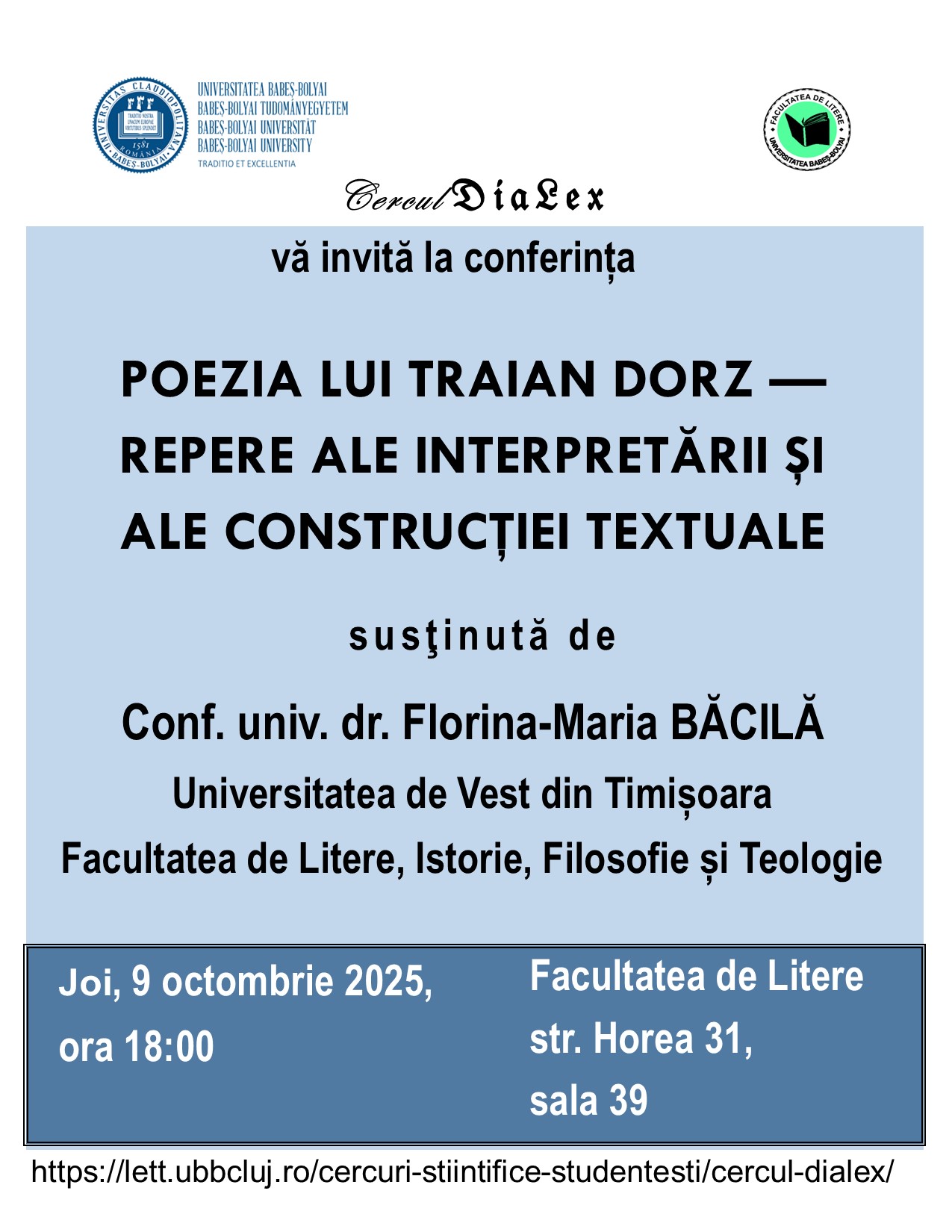 Facultatea de Litere, sala 39 Str. Horea nr. 31, Cluj-NapocaCercul DiaLex din cadrul Facultății de Litere, Universitatea Babeș-Bolyai, vă invită la conferința susținută de Dna. conf. univ. dr. Florina-Maria Băcilă, Universitatea de Vest din Timișoara.