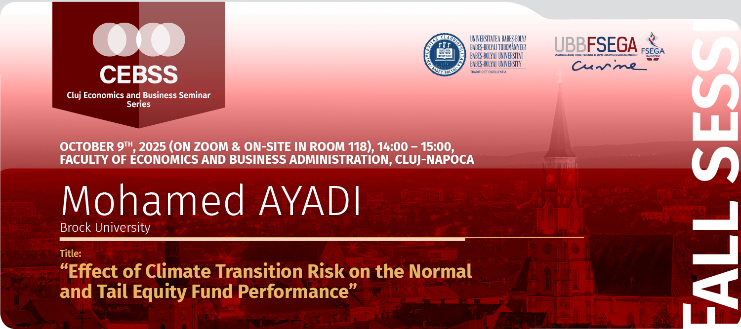 Facultatea de Științe Economice și Gestiunea Afacerilor, sala 118Facultatea de Științe Economice și Gestiunea Afacerilor vă invită la prezentarea susținută de Dl. Mohamed Ayadi, Universitatea din Brock. Evenimentul se desfășoară în cadrul ediției de toamnă a Cluj Economics and Business Seminar Series (CEBSS). CEBSS, inițiat și coordonat de …