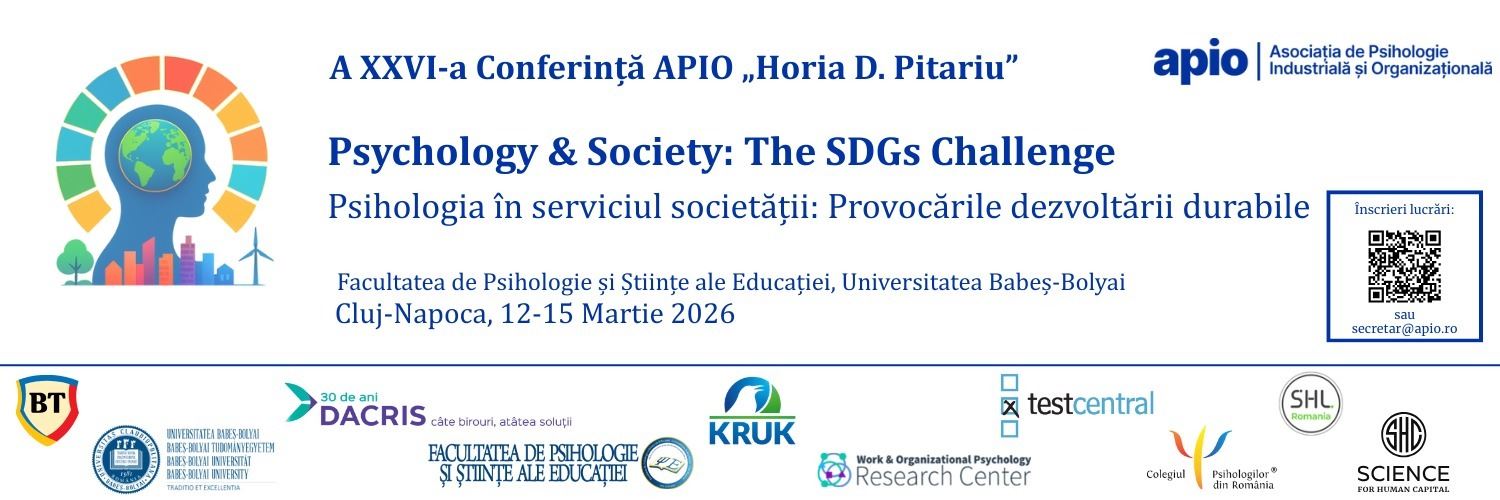 Facultatea de Psihologie și Stiințe ale Educației Str. Sindicatelor nr. 7, Cluj-NapocaFacultatea de Psihologie și Științe ale Educației și Centrul de Cercetare în Psihologia Muncii și Organizațională vă invită la cea de-a XXVI-a Ediție a Conferinței Naționale de Psihologie Industrial–Organizațională - Horia D. Pitariu- 2026, cu tema - Psihologia în serviciul …