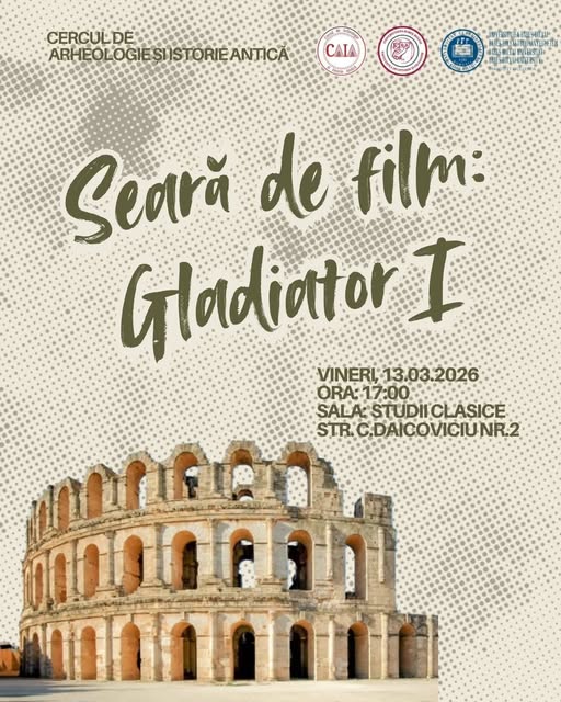 Muzeul Național de Istorie a Transilvaniei, Sala de Studii Clasice Str. C. Daicoviciu nr. 2, Cluj-NapocaCercul de Arheologie și Istorie Antică din cadrul Facultății de Istorie și Filosofie vă invită la o seară de film: Gladiator I.