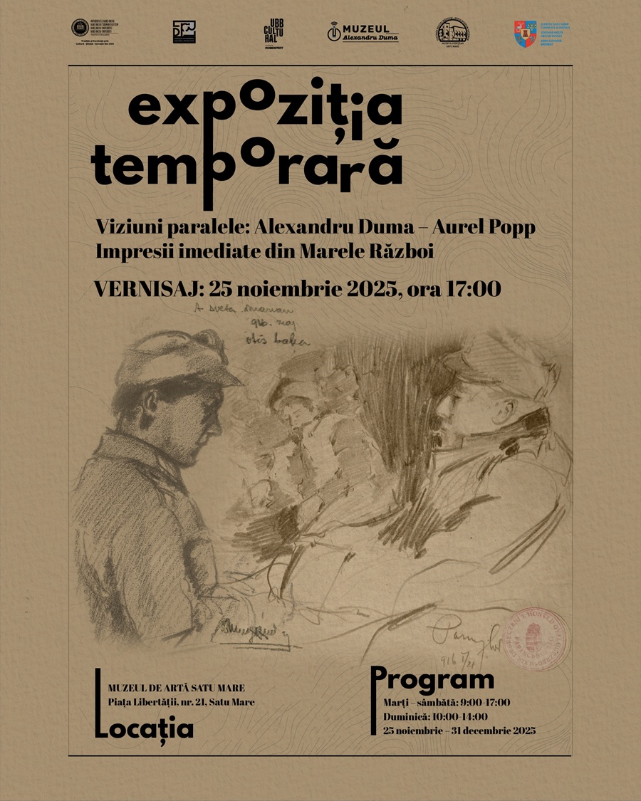 Muzeului de Artă din Satu Mare Piața Libertății nr. 21, Satu MareDirecția Patrimoniu Cultural Universitar din cadrul Universității Babeș-Bolyai, prin Muzeul Alexandru Duma, în colaborare cu Muzeul Județean Satu Mare organizează expoziția temporară - Viziuni paralele Alexandru Duma – Aurel Popp. Impresii imediate din Marele Război. Vernisajul expoziției va avea loc …
