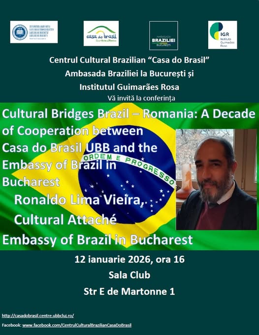 Colegiul Academic, sala Club str. Emmanuel de Martonne, nr. 1, Cluj-NapocaUniversitatea Babeș-Bolyai, prin Centrul Cultural Brazilian Casa do Brasil, în colaborare cu Ambasada Braziliei la București și Institutul Guimarães Rosa vă invită la conferința - Cultural Bridges Brazil-Romania – A Decade of Cooperation between Casa do Brasil UBB and the …