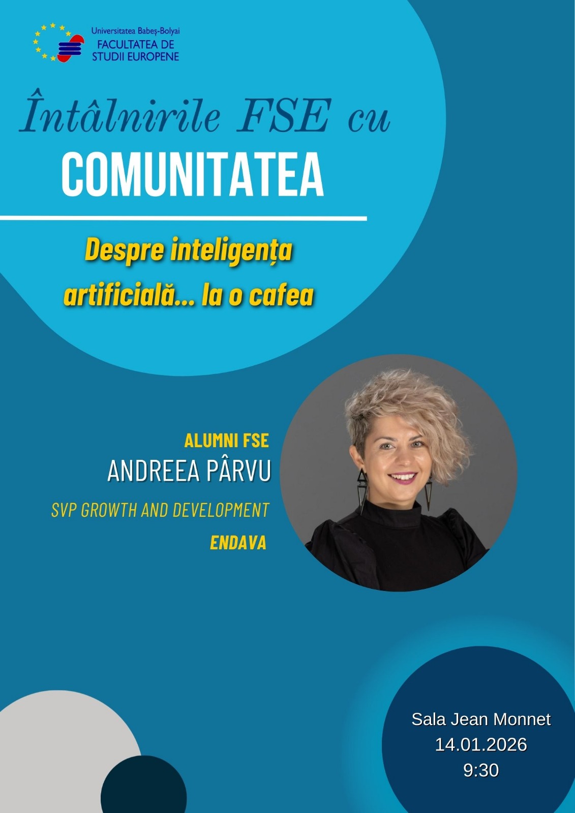 Facultatea de Studii Europene, sala J. Monnet str. Emmanuel de Martonne, nr. 1, Cluj-NapocaFacultatea de Studii Europene din cadrul Universității Babeș-Bolyai vă invită la un nou eveniment organizat în cadrul seriei Întâlnirile FSE cu comunitatea, având-o ca invitată pe Dna. Andreea Pârvu, Senior Vice President for Growth and Development în cadrul companiei ENDAVA.