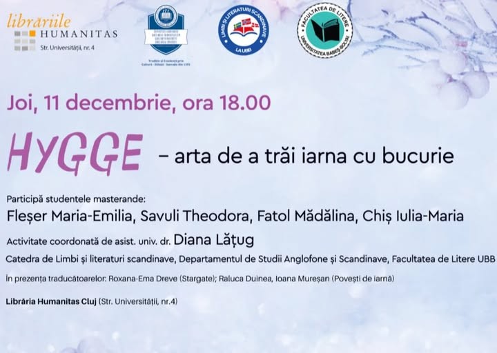 Librăria Humanitas str. Universității, nr. 4, Cluj-NapocaLibrăriile Humanitas, în parteneriat cu Facultatea de Litere, prin Catedra de Limbi și literaturi scandinave din cadrul Departamentului de Studii Anglofone și Scandinave, vă invită la evenimentul - Hygge – arta de a trăi iarna cu bucurie. Activitatea, destinată publicului …