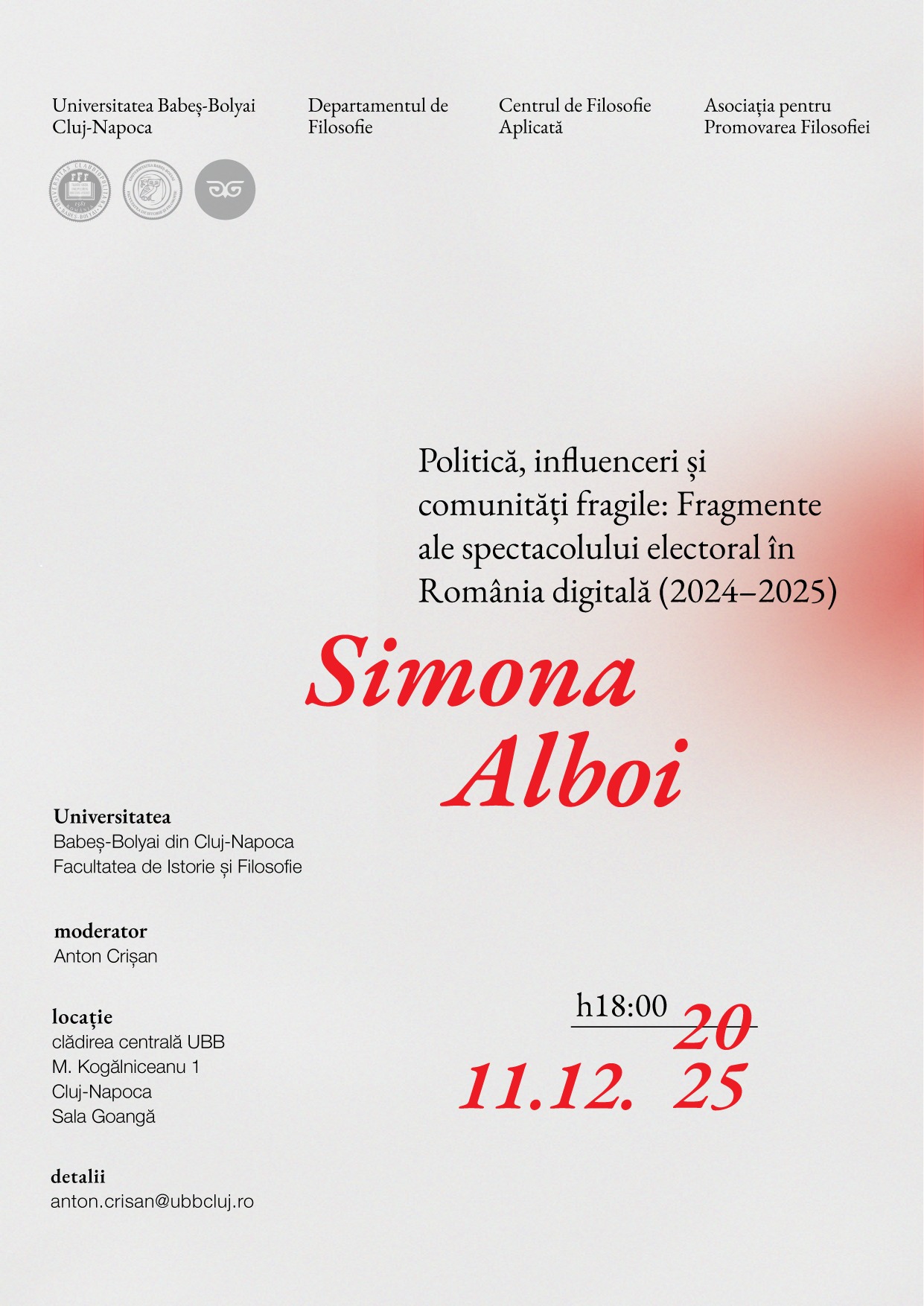 Facultatea de Istorie și Filosofie, sala S. Goangă Str. Mihail Kogălniceanu nr. 1, Cluj-NapocaFacultatea de Istorie și Filosofie prin Centrul de Filosofie Aplicată și Asociația pentru Promovarea Filosofiei vă invită la conferința susținută de către drd. Simona ALBOI, Facultatea de Istorie și Filosofie, Departamentul de Filosofie.