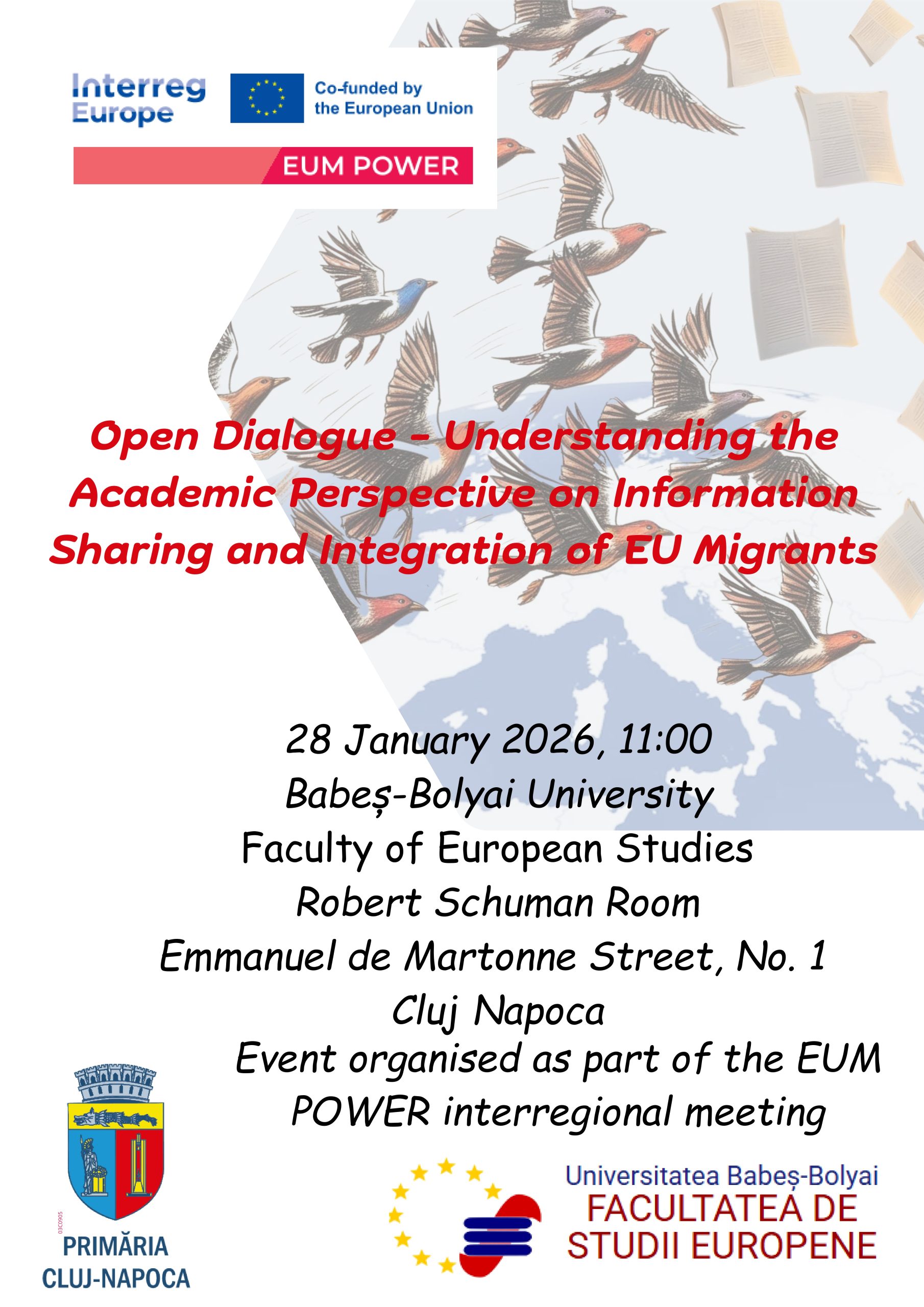 Facultatea de Studii Europene, sala R. SchumanFacultatea de Studii Europene din cadrul Universității Babeș- Bolyai alături de Primăria Cluj-Napoca, vă invită la conferința – Understanding the Academic Perspective on Information Sharing and Integration of EU Migrants, din cadrul proiectului EUM POWER, interregional meeting.
