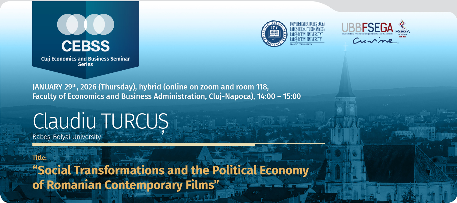 Facultatea de Științe Economice și Gestiunea Afacerilor, sala 118Facultatea de Științe Economice și Gestiunea Afacerilor vă invită la prezentarea suținută de Dl. Claudiu Turcuș, Universitatea Babeș-Bolyai. Evenimentul se desfășoară în cadrul ediției de iarnă a Cluj Economics and Business Seminar Series (CEBSS). CEBSS, inițiat și coordonat de către …