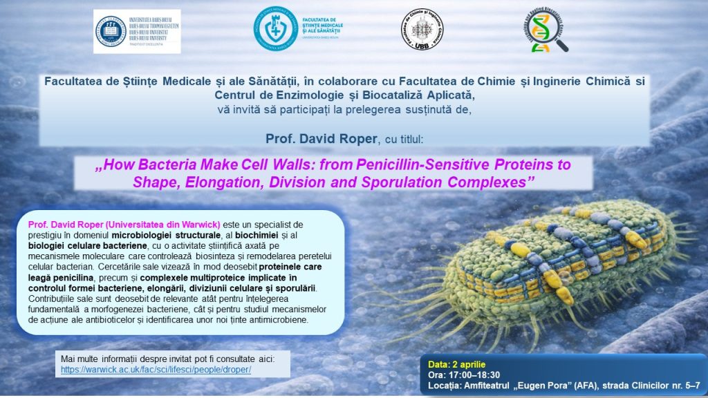 Facultatea de Biologie și Geologie, Amfiteatrul de fiziologie Animală E. Pora Clinicilor nr. 5-7, Cluj-NapocaFacultatea de Științe Medicale și ale Sănătății în colaborare cu Facultatea de Chimie și Inginerie Chimică și Centrul de Enzimologie și Biocataliză Aplicată vă invită la prelegerea susținută de Dl. prof. David Roper, Universitatea din Warwick.