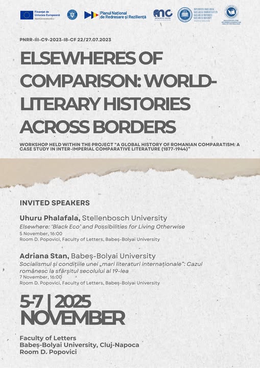 Facultatea de Litere, sala D. Popovici Str. Horea Nr. 31, Cluj-NapocaFacultatea de Litere din cadrul Universității Babeș-Bolyai vă invită la workshopul - Elsewheres of Comparison: World Literary Histories Across Borders, organizat în cadrul proiectului A Global History of Romanian Comparatism.