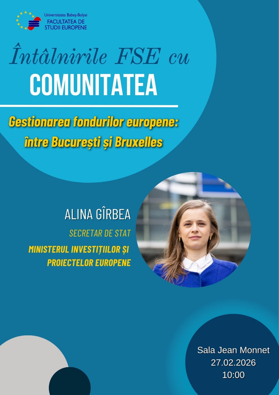Facultatea de Studii Europene, sala J. Monnet str. Emmanuel de Martonne, nr. 1, Cluj-NapocaFacultatea de Studii Europene din cadrul Universității Babeș-Bolyai vă invită la un nou eveniment organizat în cadrul seriei Întâlnirile FSE cu comunitatea, având-o ca invitată pe Dna. Alina Gîrbea, secretar de stat în Ministerul Investițiilor și Proiectelor Europene (MIPE).