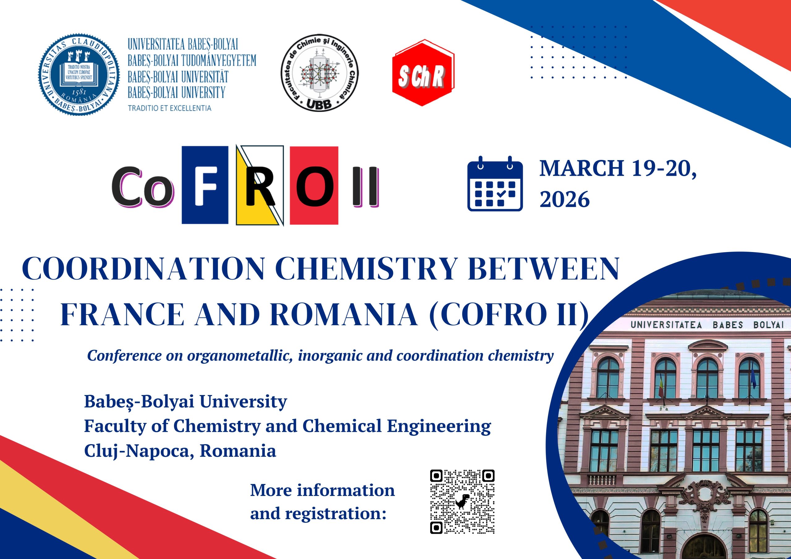Facultatea de Chimie și Inginerie ChimicăFaculty of Chemistry and Chemical Engineering, Babeș-Bolyai University invites you to the second edition of the CoFRO - A workshop on organometallic, inorganic and coordination chemistry between France and Romania.