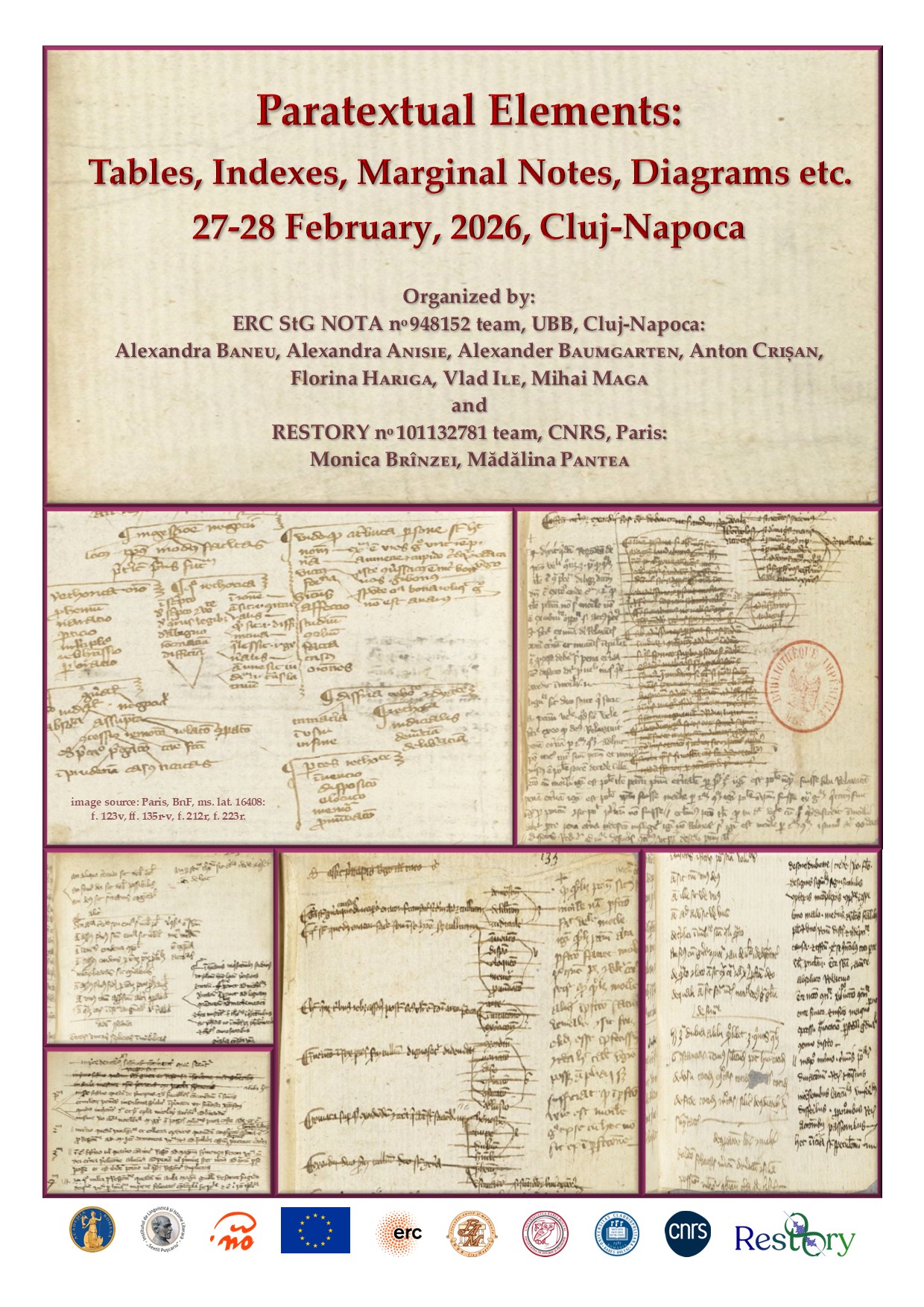 Universitatea Babeș-Bolyai Str. Mihail Kogălniceanu nr. 1, Cluj-NapocaCentre for Ancient and Medieval Philosophy, Babeş-Bolyai University, invites you to the International Workshop - Paratextual Elements: Tables, Indexes, Marginal Notes, Diagrams etc. , organized by the team ERC StG NOTA, UBB, Cluj and RESTORY – Project, CNRS, Paris.