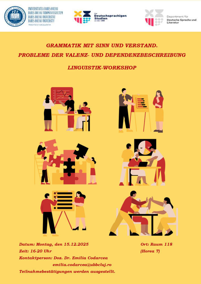 Facultatea de Litere, sala 118 Str. Horea nr. 7, Cluj-NapocaFacultatea de Litere prin Departamentul de Limbă și Literatură Germană vă invită la workshopul de lingvistică - Gramatică germană cu sens și rațiune. Probleme de descriere a valenței și dependenței. Workshopul se adresează studenților de germanistică cu scopul de a …