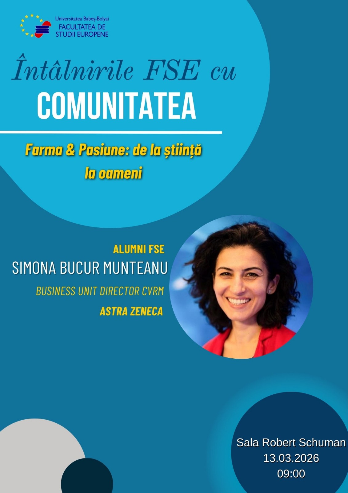 Facultatea de Studii Europene, sala Robert Schuman Str. Emmanuel de Martonne nr. 1, Cluj-NapocaFacultatea de Studii Europene din cadrul Universității Babeș-Bolyai vă invită la un nou eveniment organizat în cadrul seriei Întâlnirile FSE cu comunitatea, având-o ca invitată pe Dna. Simona Bucur Munteanu, Business Unit Director CVRM, Astra Zeneca.