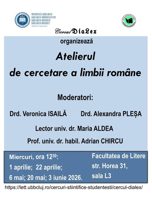 Facultatea de Litere, sala L3 Str. Horea nr. 31, Cluj-NapocaCercul DiaLex din cadrul Facultății de Litere Universitatea Babeș-Bolyai, vă invită la activitățile Atelierului de cercetare a limbii române. Moderatori: drd. Veronica Isailă, drd. Alexandra Pleșa, lector univ. dr. Maria Aldea și prof. univ. dr. habil. Adrian Chircu.