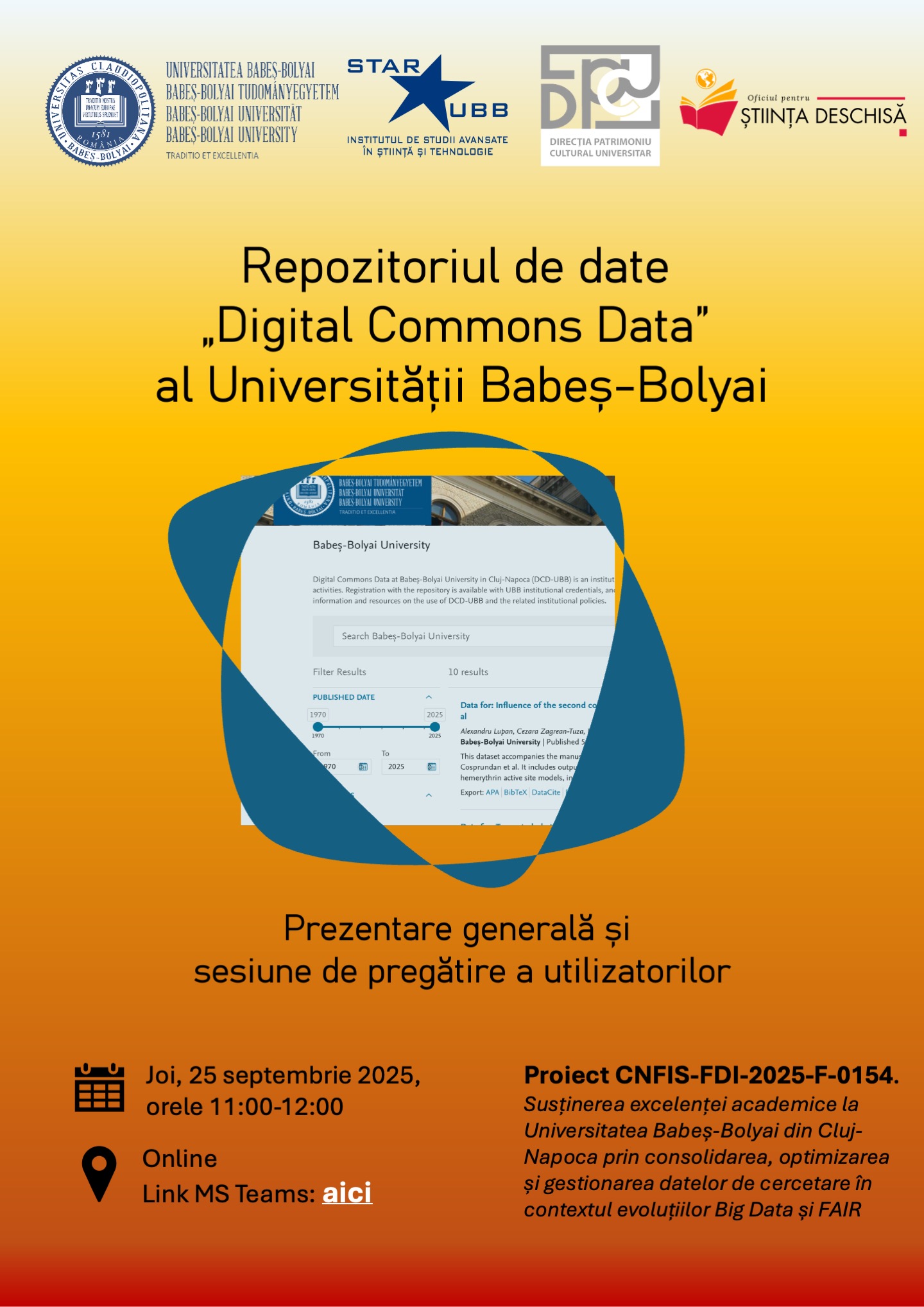 Online - Platforma Microsoft TeamsOficiul pentru Știința Deschisă vă invită la o prezentare generală și sesiune de pregătire a utilizatorilor pentru repozitoriul de date -Digital Commons Data - al Universității Babeș-Bolyai. Sesiunea este destinată personalului Direcției Patrimoniu Cultural Universitar a UBB. Prelegerea este susținută …