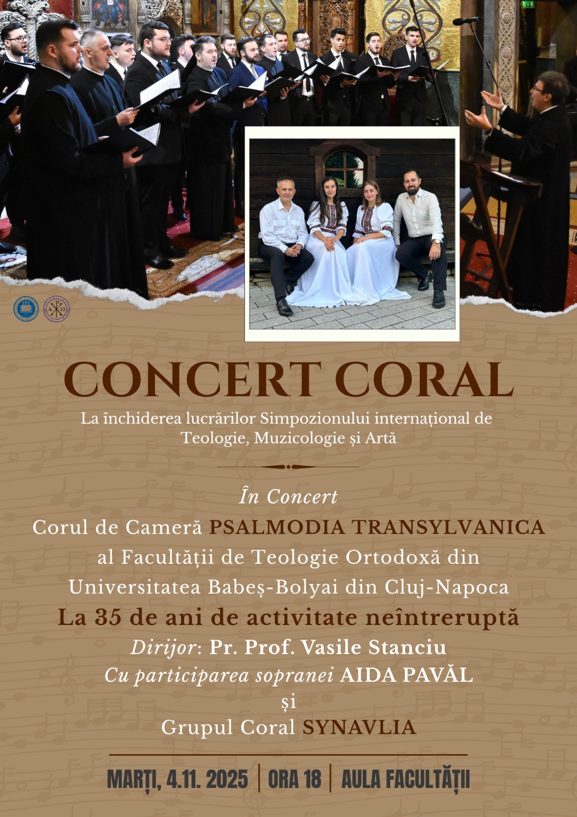 Facultatea de Teologie Ortodoxă, Aula facultății str. Episcop Nicolae Ivan f.n., Cluj-NapocaFacultatea de Teologie Ortodoxă din cadrul Universității Babeș-Bolyai vă invită la concertul susținut de Corul de Cameră Psalmodia Transylvanica al Facultății de Teologie Ortodoxă și Grupul Coral Synavlia.