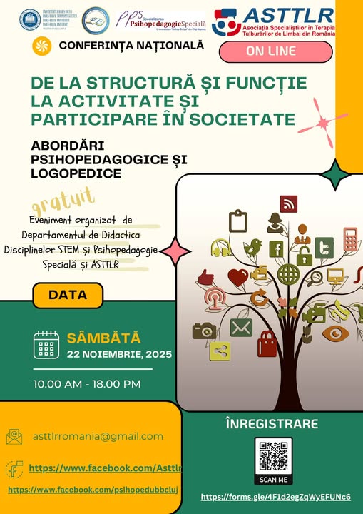 OnlineDepartamentul de Didactica Disciplinelor STEM și Psihopedagogie Specială al Universității Babeș-Bolyai, în colaborare cu Asociația Specialiștilor în Terapia Tulburărilor de Limbaj din România (ASTTLR), vă invită la conferința națională cu tema - De la structură și funcție la activitate și …