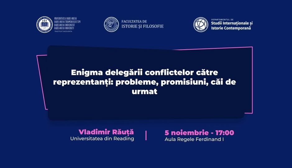 Facultatea de Istorie și Filosofie, aula Regele Ferdinand I str. Napoca nr. 11, Cluj-NapocaFacultatea de Istorie și Filosofie prin Centrul de Guvernare și Politici de Securitate vă invită la seminarul de cercetare: Enigma delegării conflictelor către reprezentanți: probleme, promisiuni, căi de urmat. Invitat: Dl.Vladimir Răuță, profesor la Universitatea din Reading.