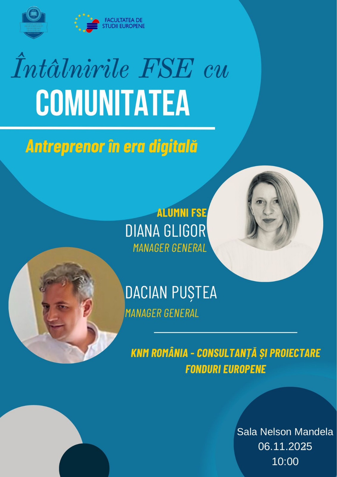 Facultatea de Studii Europene, sala N. Mandela str. Emmanuel de Martonne, nr. 1, Cluj-NapocaFacultatea de Studii Europene din cadrul Universității Babeș-Bolyai vă invită la un nou eveniment organizat în cadrul seriei Întâlnirile FSE cu comunitatea, avându-i ca invitați pe Dna. Diana Gligor și Dl. Dacian Puștea, KNM România - Consultanță și proiectare fonduri …