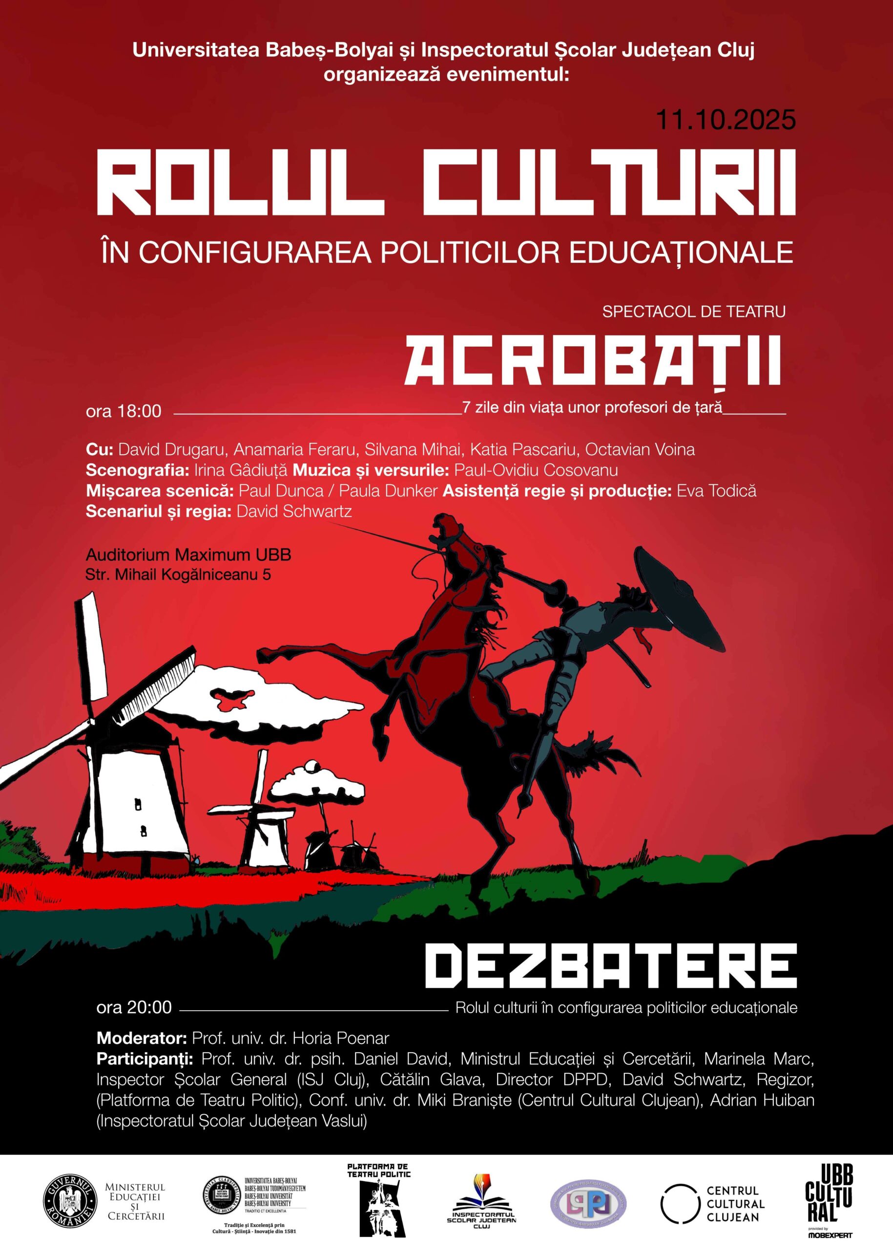 Auditorium Maximum str. M. Kogălniceanu nr. 5, Cluj-NapocaUniversitatea Babeș-Bolyai în parteneriat cu Ministerul Educației și Cercetării, Inspectoratul Școlar Județean Cluj, Departamentul pentru Pregătirea Personalului Didactic, Platforma de Teatru Politic și Centrul Cultural Clujean organizează, evenimentul - Rolul culturii în configurarea politicilor educaționale. Evenimentul va cuprinde un spectacol …