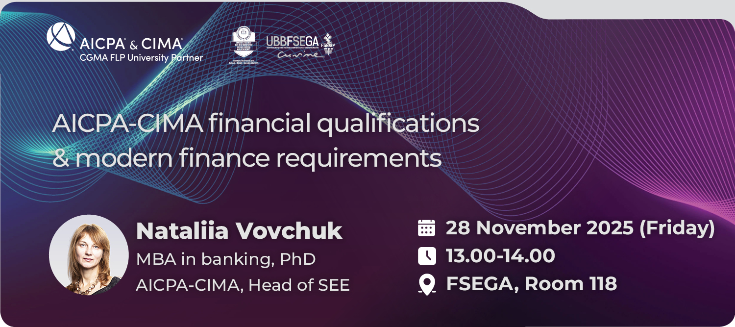 Facultatea de Științe Economice și Gestiunea Afacerilor, sala 118UBB-FSEGA, in partnership with AICPA & CIMA, is organizing the presentation - AICPA-CIMA Financial Qualifications & Modern Finance Requirements, followed by an interactive Q&A session. Invited speaker: Nataliia Vovchuk MBA in Banking, PhD Head of SEE, AICPA-CIMA