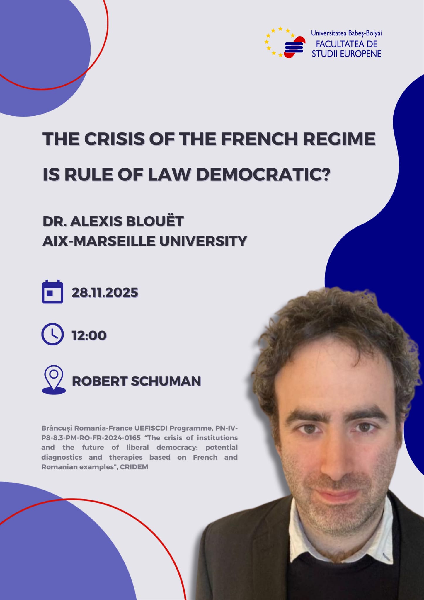 Facultatea de Studii Europene, sala Robert Schuman Str. Emmanuel de Martonne nr. 1, Cluj-NapocaFacultatea de Studii Europene din cadrul Universității Babeș-Bolyai vă invită la prelegerea susținută de Dl. dr. Alexis Blouët, Aix-Marseille University.
