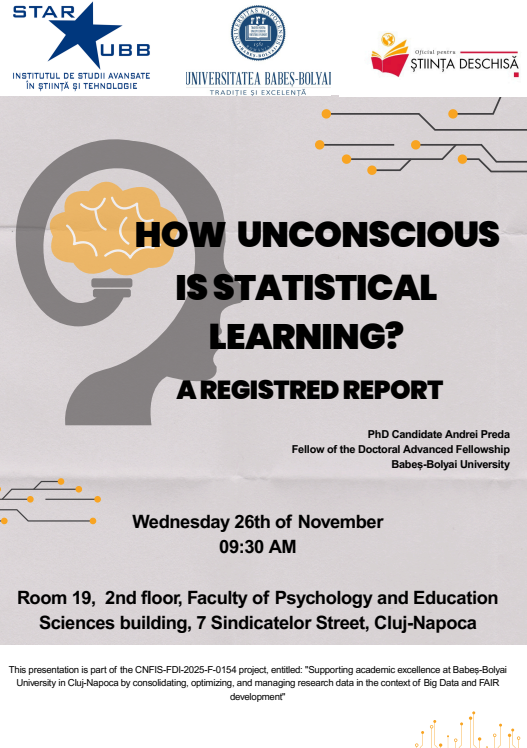 Facultatea de Psihologie și Științe ale Educației, sala 19 Str. Sindicatelor nr. 7Institutul STAR-UBB și Oficiul pentru Știința Deschisă din cadrul Universității Babș-Bolyai, vă invită la prelegerea - How Unconscious is Statistical Learning? A Registered Report, susținută de Dl. Andrei Preda, doctorand, Universitatea Babeș-Bolyai. Prezentarea este realizată în cadrul STAR UBB Doctoral …