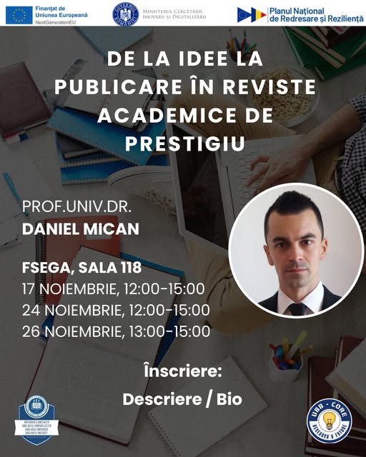 Facultatea de Științe Economice și Gestiunea Afacerilor, sala 118Universitatea Babeș-Bolyai din Cluj-Napoca prin Centrul Regional Nord-Vest de Orientare în Carieră al Cercetătorilor, UBB-CORE vă invită la workshopul - De la idee la publicare în reviste academice de prestigiu, susținut de Dl. prof. univ. dr. Daniel Mican.